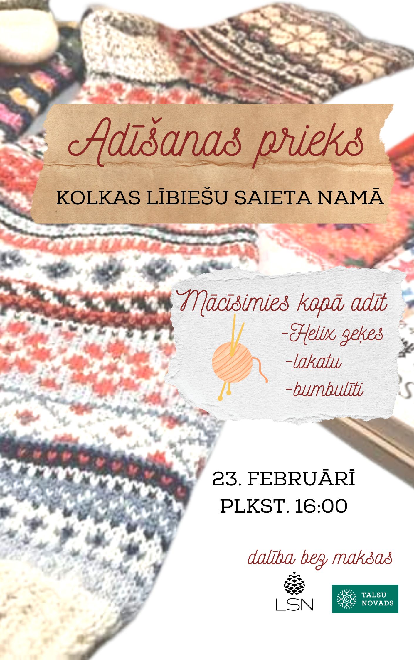 Būs sil­ta zāļu tēja ar sil­tām saru­nām! Līdzi jāņem ada­tas, dzi­jas kamo­li­ņi, laba oma un dar­bo­ties prieks!
