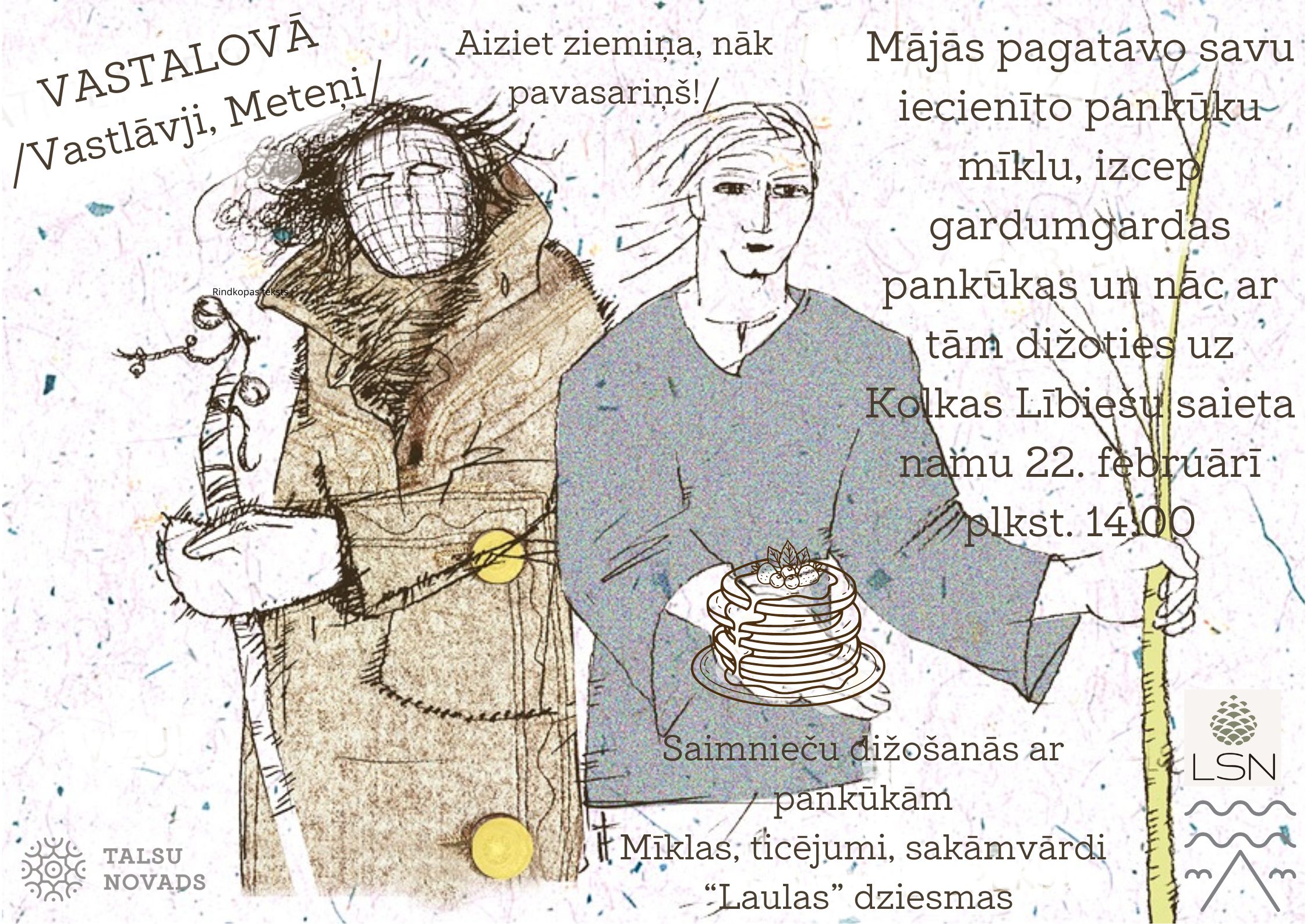 Šie svēt­ki bija nozī­mī­gi un prie­cī­gi, tie ieva­dī­ja pava­sa­ra un jau­na saim­nie­cis­kā gada sāku­mu. Tas bija pirms­ga­vēņa laiks, kad vēl varē­ja sātī­gi paēst. Tāpēc gal­dā tika likts bagā­tīgs ēdiens – pan­kū­kas, cūkas gal­va, zirņi, pīrā­gi un citi sātī­gi ēdie­ni. Apaļas for­mas ēdie­ni (pie­mē­ram, pan­kū­kas) sim­bo­li­zē sauli, kas ar kat­ru die­nu kļūst spēcīgāka.
