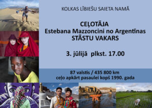 Este­bans ceļo jau no 1990. gada, pa šo lai­ku ir apmek­lē­ji 87 val­stis un pie­va­rē­jis teju pus mil­jo­nu kilo­met­ru. Viņš ceļo, fotog­ra­fē un rak­sta par saviem ceļo­ju­miem grā­ma­tas un uztur blo­gu. Šob­rīd Este­bans pār­vie­to­jas ar velo­si­pē­du un pie mums atbrauks no Tal­li­nas. Stās­ti būs angļu valo­dā ar tul­ko­ju­mu lat­vis­ki. Tie­ka­mies 3. jūli­jā plkst. 17.00 Kol­kas Lībie­šu saie­ta namā!