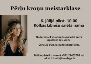 Pēr­ļu kro­ņu meis­tarkla­se kopā ar Lel­di Baņ­ģi no zīmo­la LaCrown. Meis­tarkla­ses cena 25 EUR per­so­nai, cenā iekļau­ti visi nepie­cie­ša­mie mate­riā­li. Iepriek­šē­ja pie­teik­ša­nās Kol­kas Lībie­šu saie­ta namā vai zva­not +371 29402093. Trīs stun­du lai­kā kat­ra tik­sim pie sava kroņa.