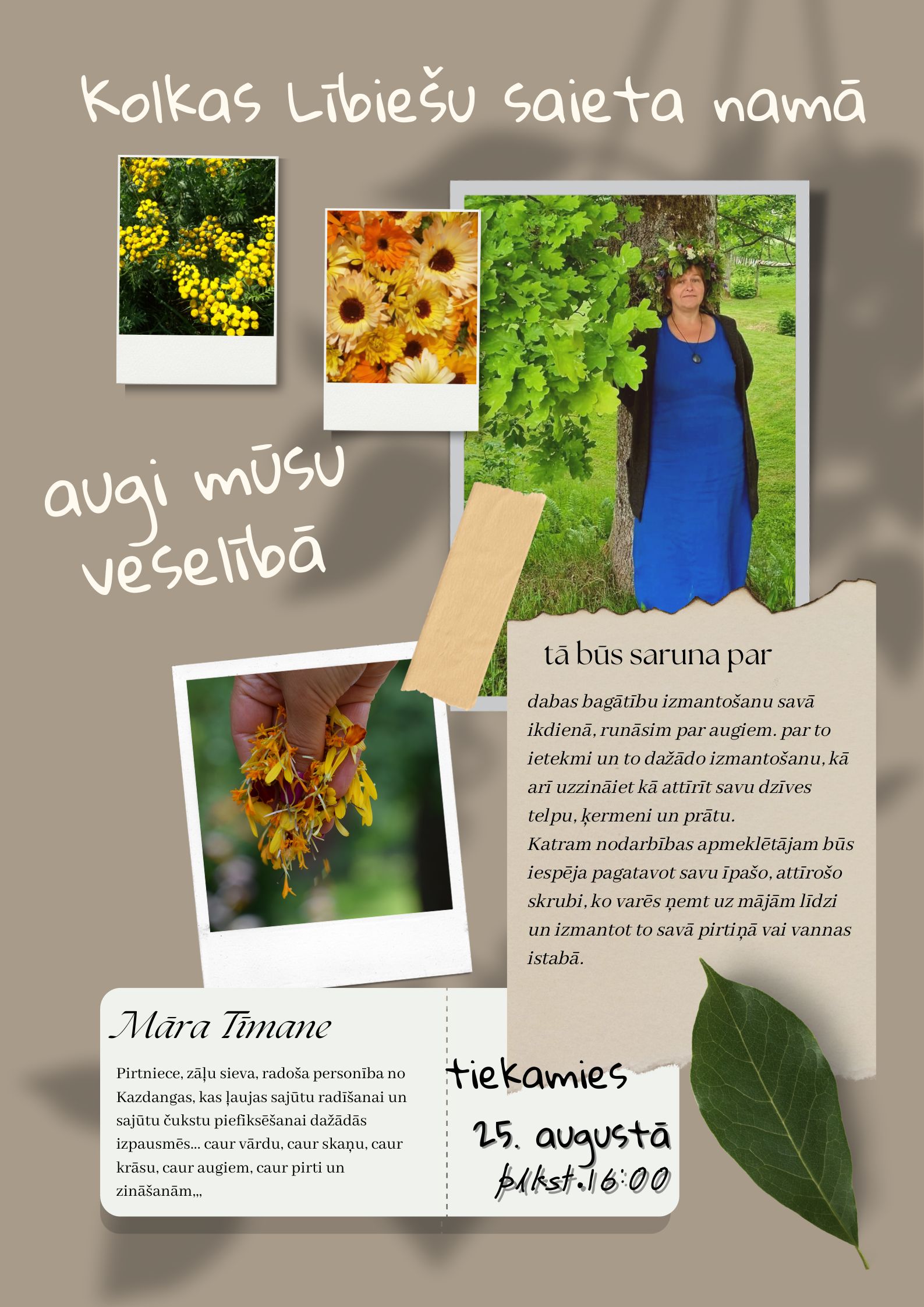 Kolkas lībiešu saieta namā 25.augustā 16.00 tikšanās ar Māru Tīmani – pirtnieci, zāļu sievu, radošu personību no Kazdangas, kas ļaujas sajūtu radīšanai un sajūtu čukstu piefiksēšanai dažādās izpausmēs .…. caur vārdu, caur skaņu, caur krāsu, caur augiem, caur pirti un zināšanām.