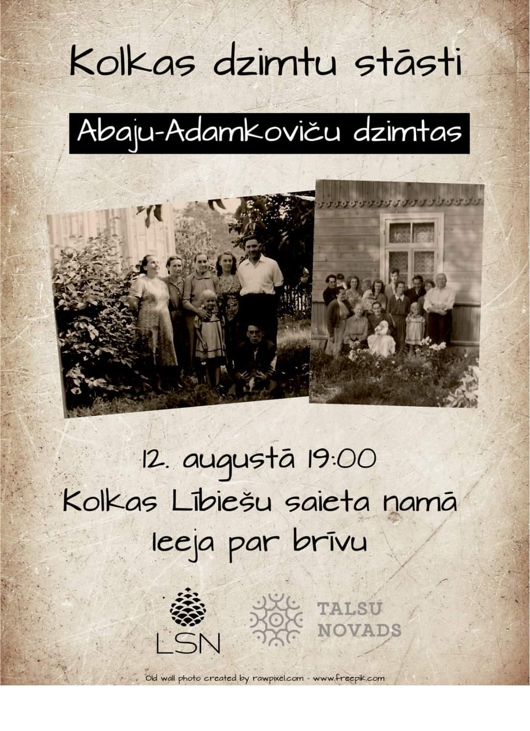 Kolkas lībiešu pēcteču dzimtām veltītajā vakarā aplūkosim abas dzimtas vienkopus. Pasākuma iesākumā paredzēta bilžu prezentācija un stāstījums par Abaju un Adamkoviču dzimtas pārstāvjiem no pašiem senākajiem laikiem līdz pat mūsdienām. Sanākušie būs mīļi aicināti dalīties īsos atmiņu stāstos par aplūkotajām personām, kuras savulaik bijušas gana aktīvas Kolkas ciema darba un sabiedriskajā dzīvē. Vakaru papildinās muzikāls pavadījums Māras, Mārtiņa un Rūtas Abaju izpildījumā.