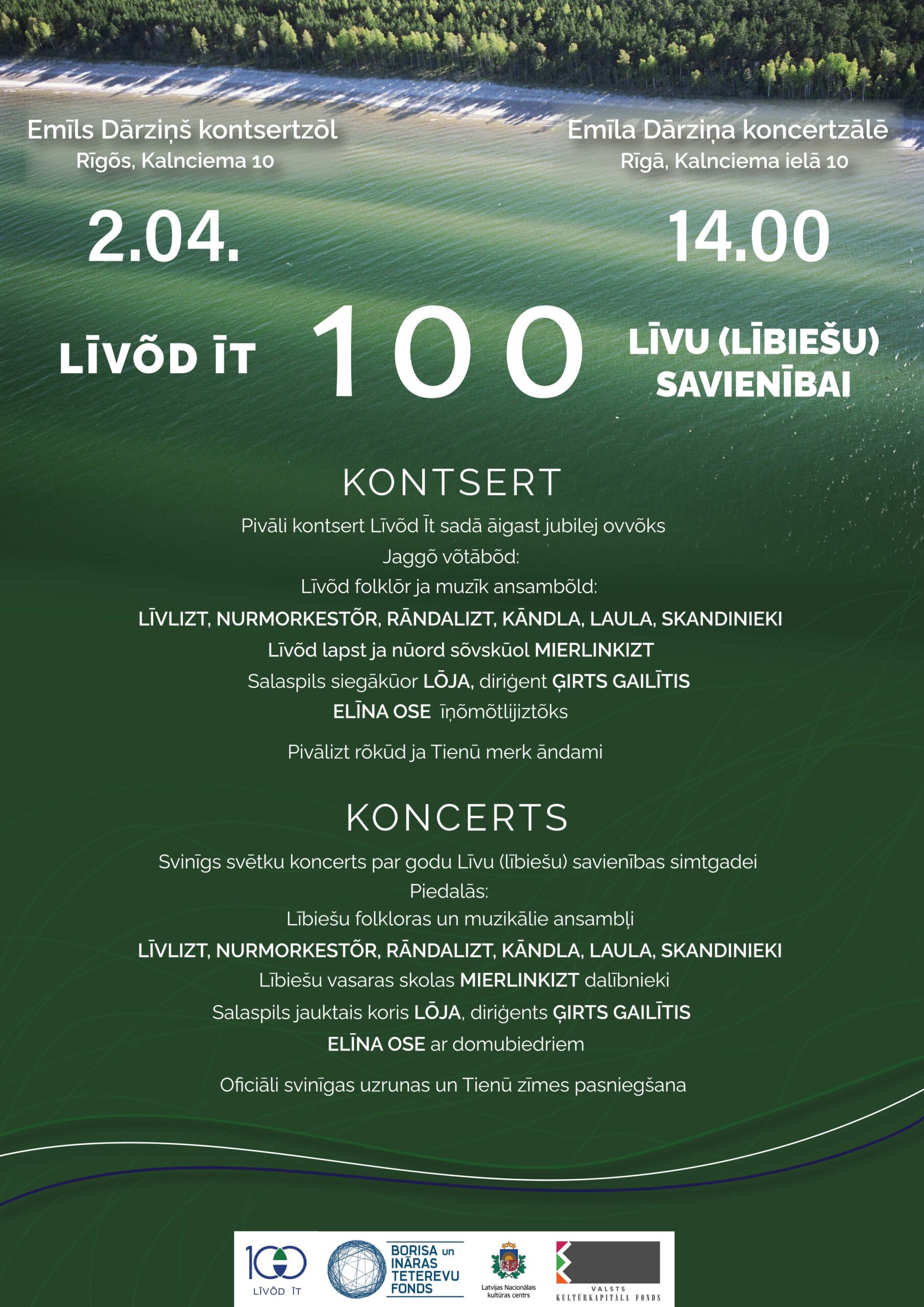 2. aprī­lī Rīgā, Emī­la Dār­zi­ņa kon­cer­tzā­lē Līvu (lībie­šu) savie­nī­bas (Līvõd Īt) sim­tga­dei vel­tī­ta­jā kon­cer­tā ska­nēs lībie­šu valo­da – lībie­šu muzi­kā­lie kolek­tī­vi Kāndla, Rānda­list (Ventspils), Lau­la (Kol­ka), Līvlist, Nurmorkestõr (Rīga) kopā ar fol­klo­ras kopu Skan­di­nie­ki un Salas­pils jauk­to kori Lōja diri­ģen­ta Ģir­ta Gai­lī­ša vadī­bā atska­ņos iecie­nī­tas lībie­šu dzies­mas un melo­di­jas. Kon­cer­ta prog­ram­mas vadī­tā­ja – Lat­vi­jas Nacio­nā­lā teāt­ra aktri­se un reži­so­re Mari­ja Bēr­zi­ņa – aici­nās ska­tī­tā­jus un klau­sī­tā­jus vizuā­li krā­sai­nā ceļo­ju­mā pa Līvu savie­nī­bas esī­bas gadu līk­lo­čiem, kuros né mazums paveik­to darbu.