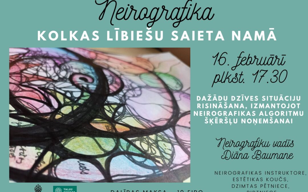 16. februārī plkst. 17.30 Neirografika Kolkas Lībiešu saieta namā! Dažādu dzīves situāciju risināšana, izmantojot Neirografikas algoritmu šķēršļu noņemšanai. Vadīs Diāna Baumane, Neirografikas instruktore, Estētikas koučs,...