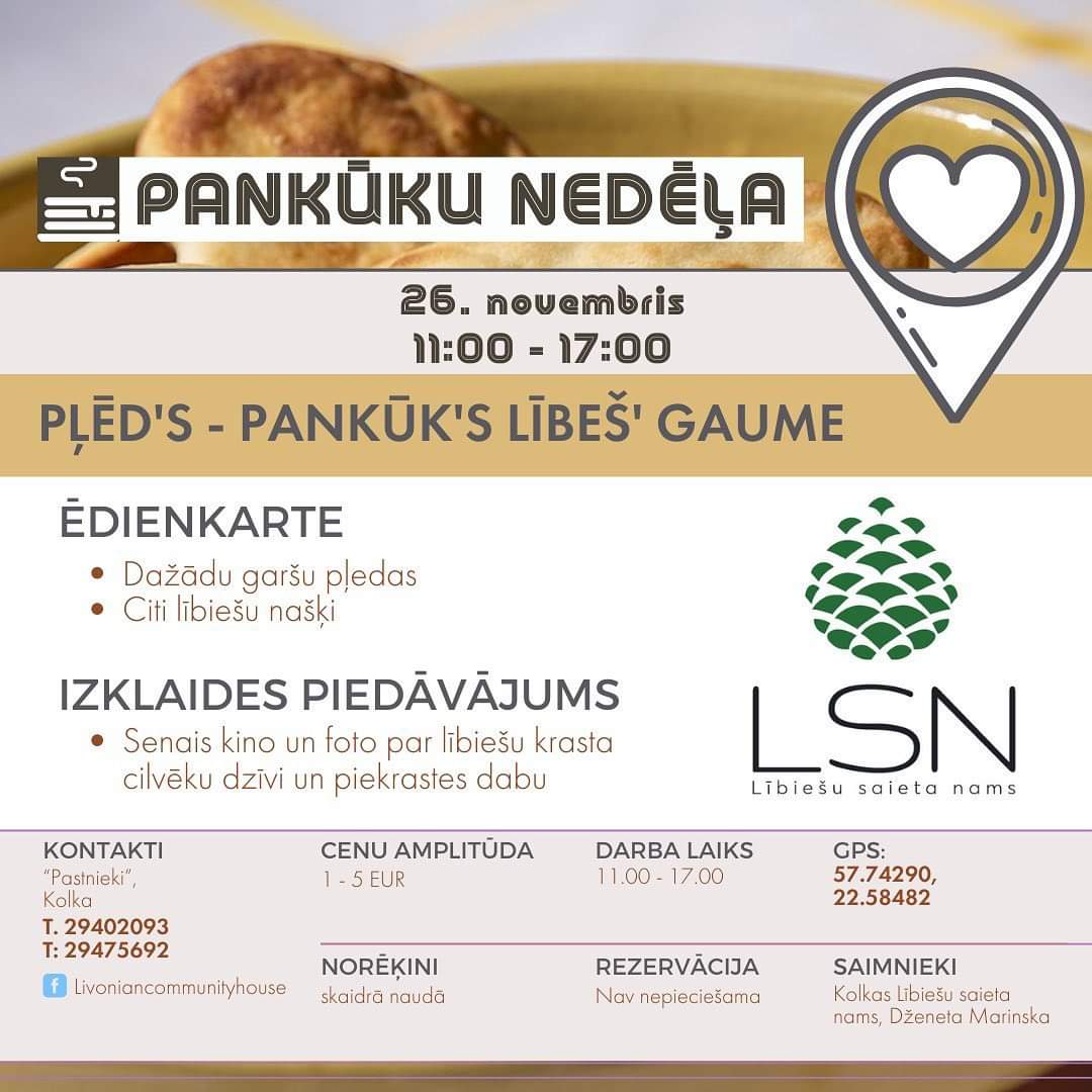 PĻĒD’S – PANKŪK’S LĪBIEŠ” GAUMĒ un citus lībiešu našķus baudīsim Kolkas Lībiešu Saieta namā.