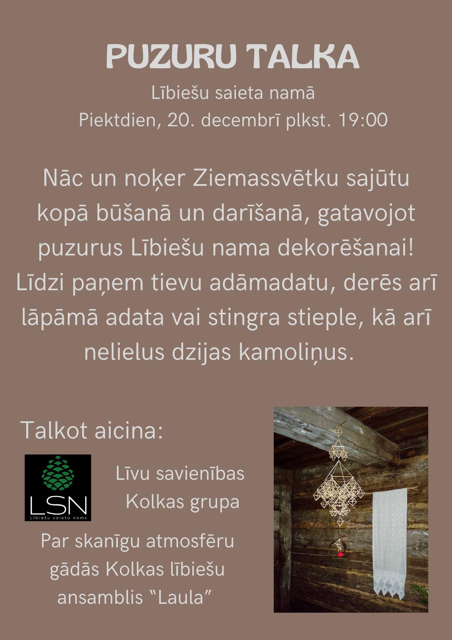 20.decembrī dari­nā­jām puzu­rus – puzu­ris, luk­tu­ris, krī­ģis jeb spur­gu­lis ir tra­di­cio­nāls ieka­ra­mais tel­pu rotā­jums, kas gata­vots, uz die­ga save­rot nied­ru, sal­mu vai smil­gu pos­mi­ņus un papil­di­not tos ar ēveļ­skai­dām, dzī­pa­riem, putnu spal­vām un lupa­tu vai papī­ra gabaliņiem.