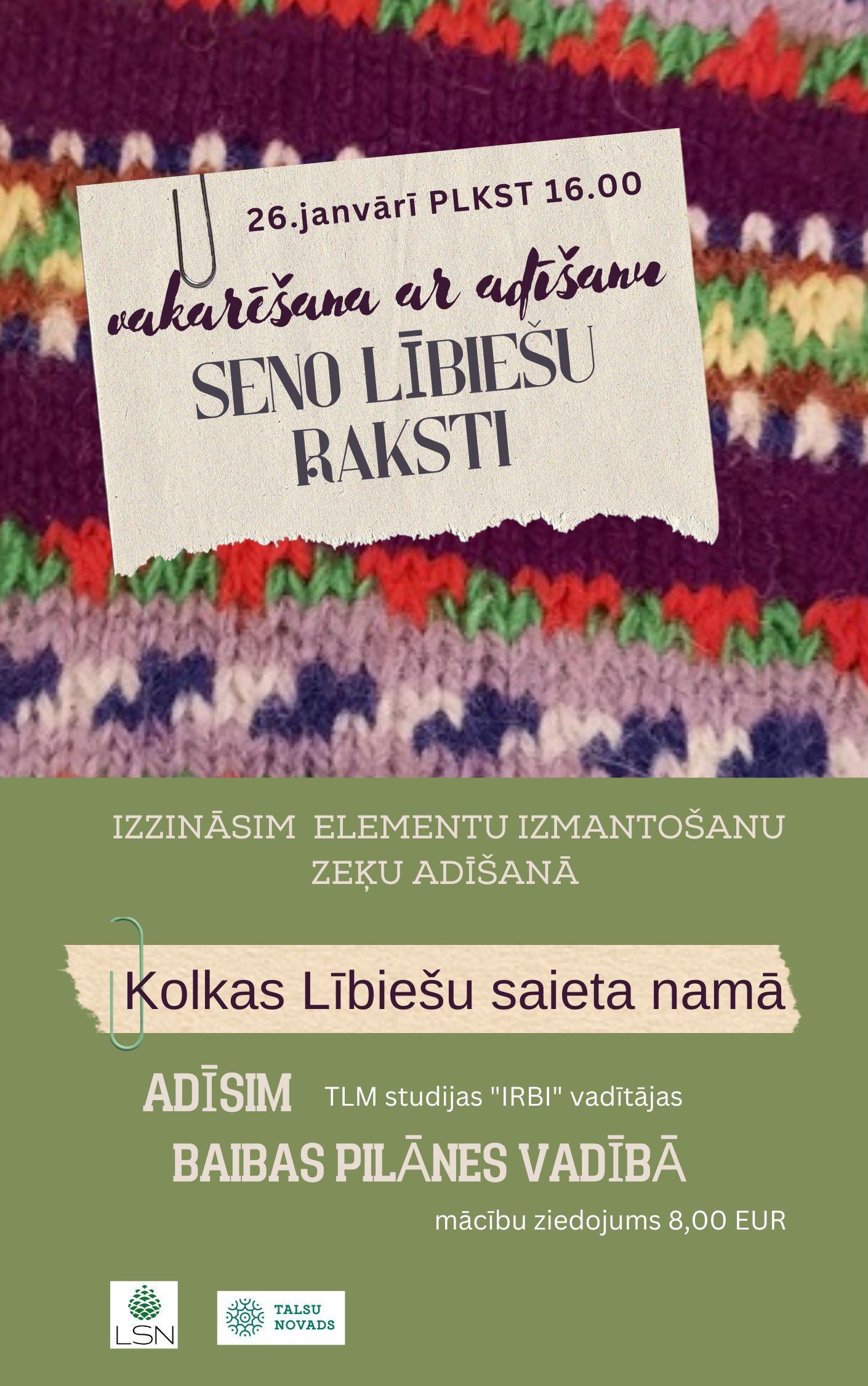 26. janvārī plkst. 16.00 aicinām pulciņā vakarēt Kolkas Lībiešu saieta namā ar lībiešu rakstiem un TLMS «Irbi» vadītāju Baibu Pilāni. Turpināsim apgūt jaunus meistarstiķus adīšanā. Dalīsimies savās pieredzēs un materiālos, ko esam izzinājuši pēc iepriekšējās nodarbības.