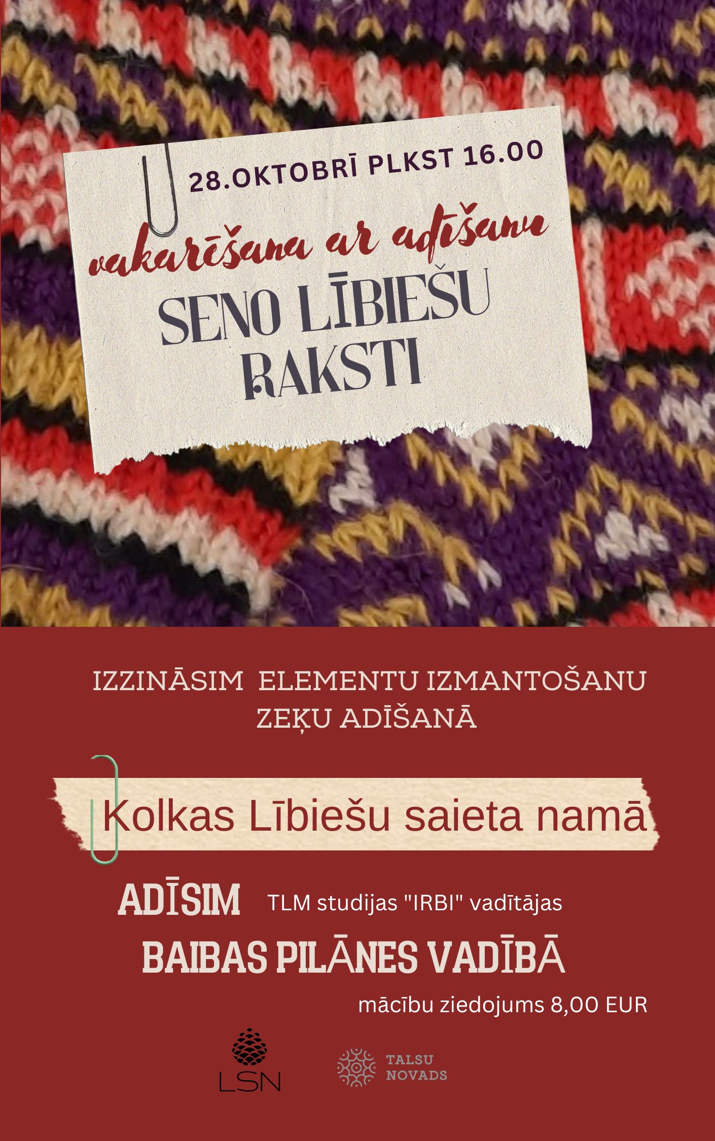 Vakarēšana ar adīšanu Okt 17, 2022 Vakarēšana ar lībiešu rakstiem un TLMS «Irbi» vadītāju Baibu Pilāni. Runāsim par zeķēm, par seno elementu izmantošanu mūsdienās. Mācību ziedojums 8. 00 EUR.
